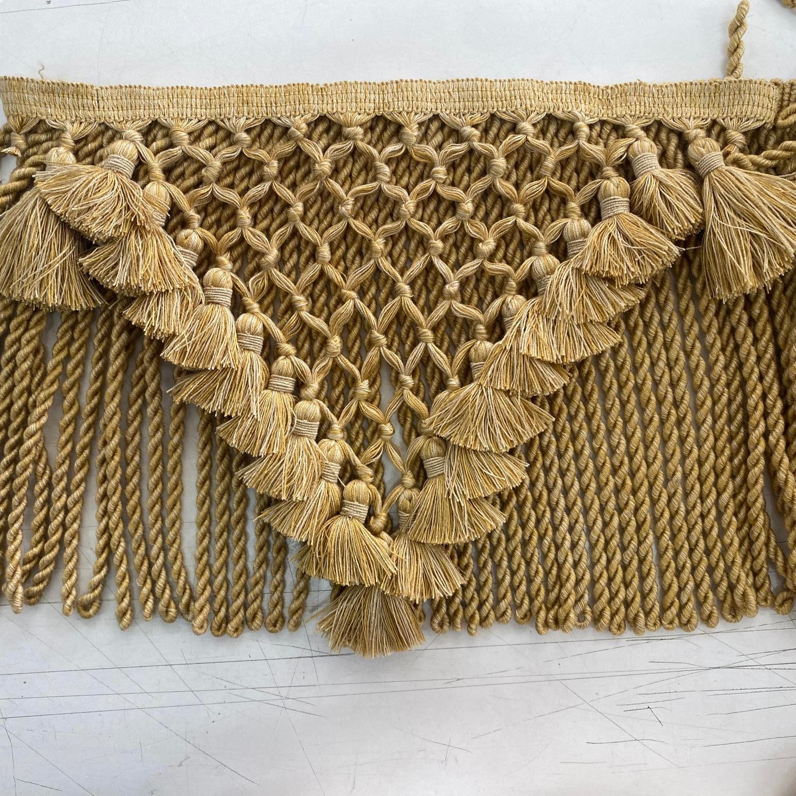 Add a touch of timeless elegance to your décor with this luxurious double fringe, inspired by age-old patterns. Meticulously handcrafted in a warm, golden hue, it features an intricate knotted design with layered tassels and a second row a bullion fringe. The result is a rich, opulent look. Whether draped on curtains or upholstered on furniture, this double fringe exudes sophistication and heritage craftsmanship.