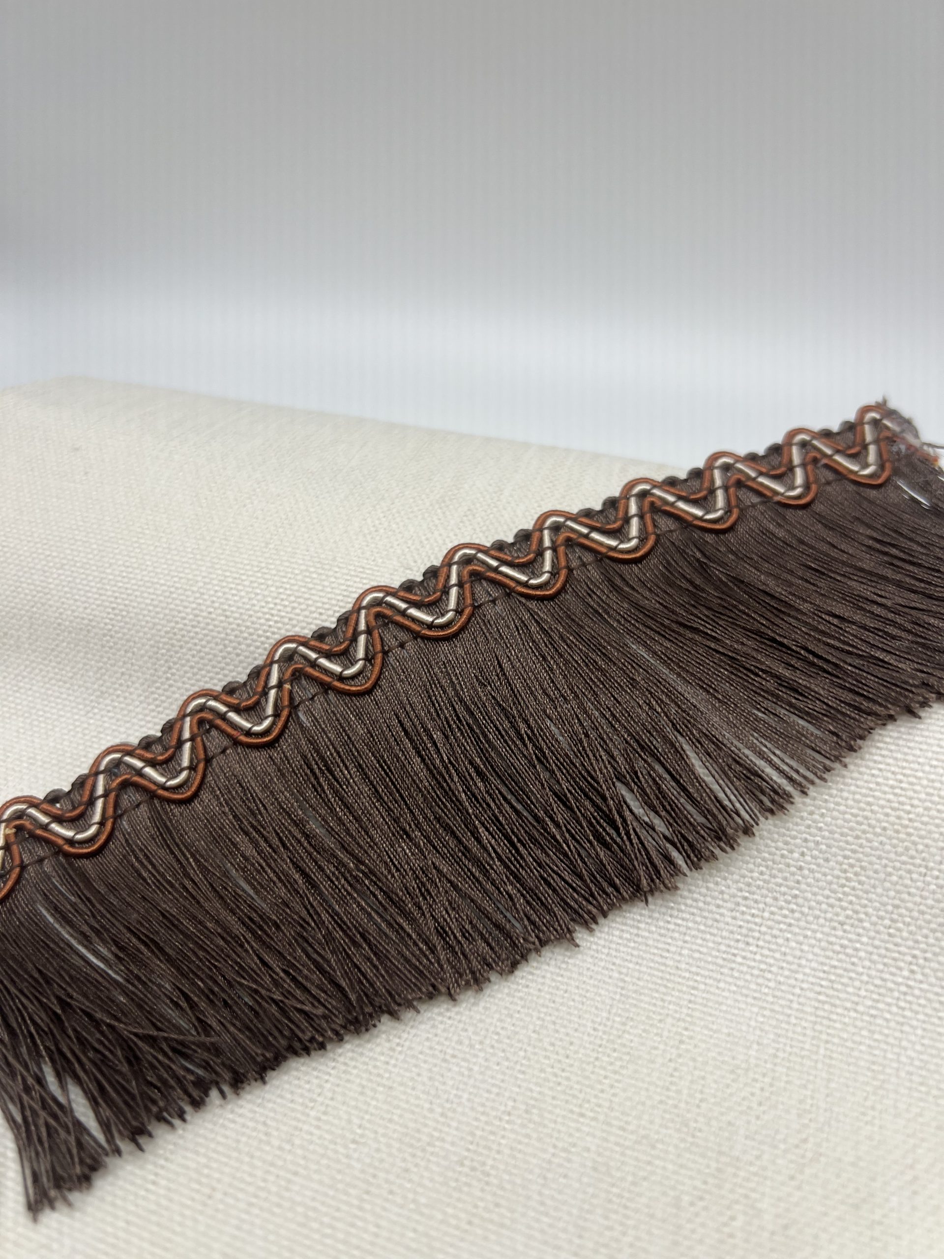 This fringe speaks to the senses. The matte brown base grounds the design with warmth and natural elegance, while the embroidered wave in luminous cream and copper catches the eye—evoking movement and depth. Neuromarketing studies show that texture, contrast, and color harmony increase emotional engagement and memory retention. This trim not only enhances objects—it tells a tactile story of refinement.